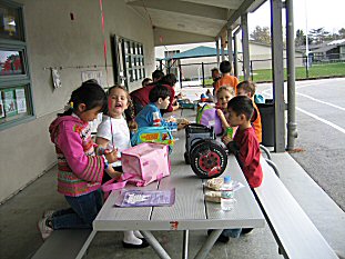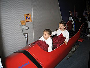 | Now that the girls are a bit older, we joined the Tech Museum in San Jose. HERE's the girls riding in a toboggan simulator. |