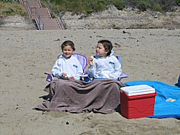 Our first beach outing of the year was in April. HERE's 2 girls having a snack at Davenport Landing. |