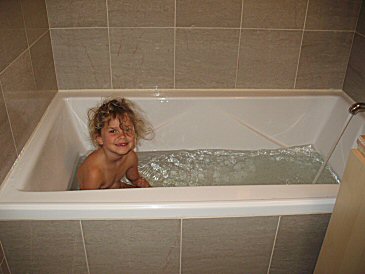 Their new bathroom had been completed while they were away. This tub is almost big enough to do laps in... HERE's Taylor checking it out. |