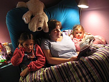 A week later, the girls went to a birthday party at Razzberry Lips. They basically get a kids' version of "a day of beauty" in 1-1/5 hours. (you can't really see it here, but their hair was purple/pink and sparkley!) |