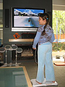| Jordan trying out the "Wii Fit" balance board. We now have skiing, snowboarding, etc.. for it. |