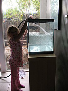 And, in October, the girls got a fish tank as a reward for cleaning their playroom. We started out with 4 fish- as of January, we still have 1 survivor and will be repopulating soon. HERE's Taylor helping with the initial fill of the tank. |