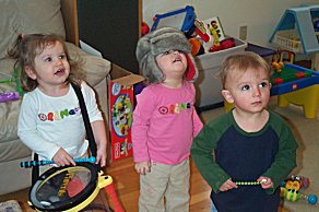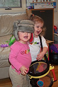 Someone in the crowd got them a drum for Christmas. Fortunately, it's not very loud and they don't hit it very hard... yet. Jordan knows the strap is too long, but she's working it anyway. |