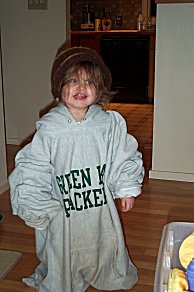 | Jordan loves dressing up. Here she models one of dad's sweatshirts and his hat [ed- be careful before criticizing the hat- George's gramma knitted it for him when he a teenager..!]I | ![]() |