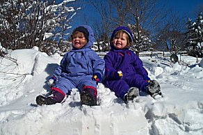 | Ah- perfect photo op! Let's sit both babies on top of the snowpile and photograph them. Dad's instructing Taylor to stay put and not slide off the wall and crash into the driveway because that will ruin the picture... | ![]() |