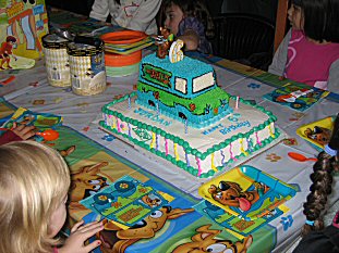 The party theme was "Scooby Doo". HERE, George and MJ decorate a "Mystery Machine" centerpiece for the cake. [ed] this was the first of 2- they did one just for practice...hard core. |