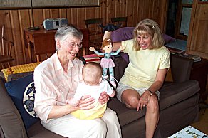 The first time was to celebrate Carol's (MJ's mother) birthday. Here's Margaret and Carol entertaining Taylor with the puppet... |