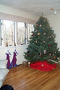 | Here is a picture of the girl's first Christmas tree with their stockings hung to the left! |