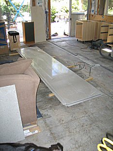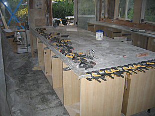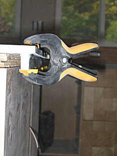When all sheets are seamed and sanded, the edges are applied. Here's where we use up all those 1" strips we cut a while ago. Cut the strip to length, clean everything with alcohol and set out the clamps. Then apply the glue, set the strip and clamp like mad! The glue sets up a couple of minutes, so you must hustle! |