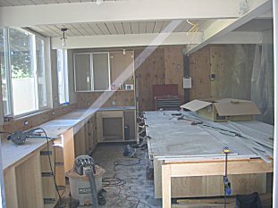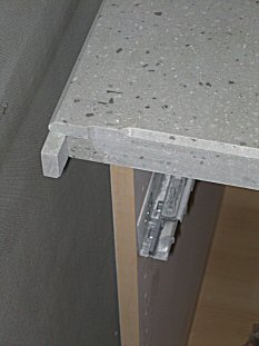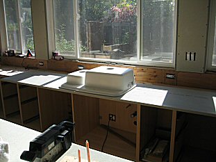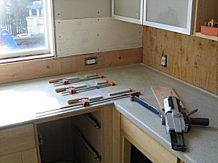 The undermount sink- one of the best reasons to have solid surface countertops! - Cut a hole in the plywood cabinet that's big enough for the sink. - Mark the underside of the sheet so you know exactly where it goes. - Flip the sheet over and position the sink exactly. Make sure the front and back are in the right places! - Apply stop blocks around the sink with hot glue - Apply the adhesive liberally around the sink flange and glue it on. The pros have clamps that go thru the hole to hold it in place. I don't, so i sit on it for 15 minutes ;-) |