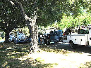 Then the contractor showed up with 3 large trucks. The blue thing in the middle is his compressor/vacuum cleaner that he uses to screw the mastic off the floor after the tile is removed. |